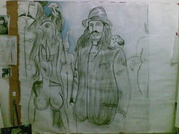 Hundreds of bands go through the Evelyn. Some go completely under my radar, but that was never going to happen with Martin Martini and his Bone Palace Orchestra. The posters for his gigs, wrapped around the poles of Brunswick Street and blu-tacked on the windows of the Evelyn, were colourful, creative, quirky, sometimes surreal, and reminded me of maybe vaudevillian travelling circuses. And when I actually saw the guy, it completed the picture — he looked like a circus ringleader, or one of those guys running a freakshow in the early 1900s. Him and his posters were clearly part of the same act, so his awareness of image impressed me. His actual performances were also really good, which reminded me of Tom Waits. So it was, as they say, a no-brainer to do a portrait of him, and it was also obvious that his posters should be there with him. Since those days, he’s founded a short-lived record label, which produced “some of the best records never heard”, and after that he became an expert on wild mushrooms, running fungi workshops, during “Mushroom Meanders”, where you follow him around the bush and find mushrooms together. Life takes people in different directions.